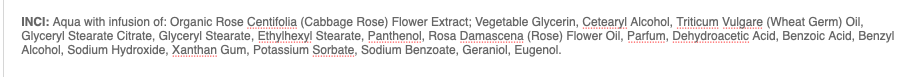 - Organikus rózsa kivonat: több mint 300 hatóanyagot tartalmaz, amelyeknek köszönhetően támogatja a bőr természetes sejtanyagcseréjét, és segíti a száraz és öregedő bőr újjáélesztését. Megfordítja az öregedés tüneteit, csökkenti a ráncokat, feszessé teszi, kisimítja és világosítja a bőrt.